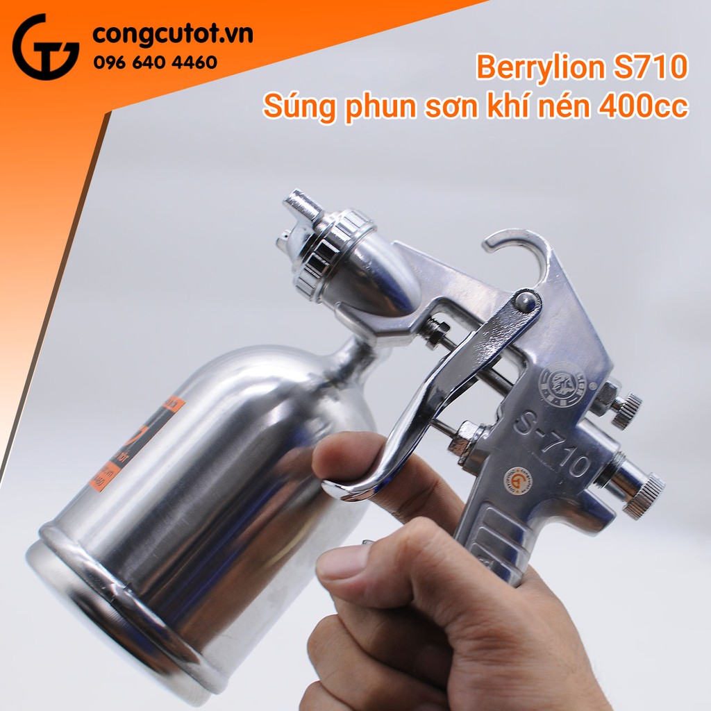 Súng phun sơn Berrylion S710 là dòng súng phun sơn dùng hơi khí nén có bình sơn với lỗ phun ∅1.5mm - ∅1.6mm - ∅1.8mm để phun cửa sắt, phun bảo vệ bề mặt, phun hàng rào, hay phun sơn tường.Súng phun sơn Berrylion S710 dùng khí nén để tạo ra áp suất phun (Air Spray) chứ không phải là loại airless (nén sơn). Khi khí nén đi qua lỗ phun sơn , dòng khí nén sẽ xé tơi sơn ra thành các hạt nhỏ.