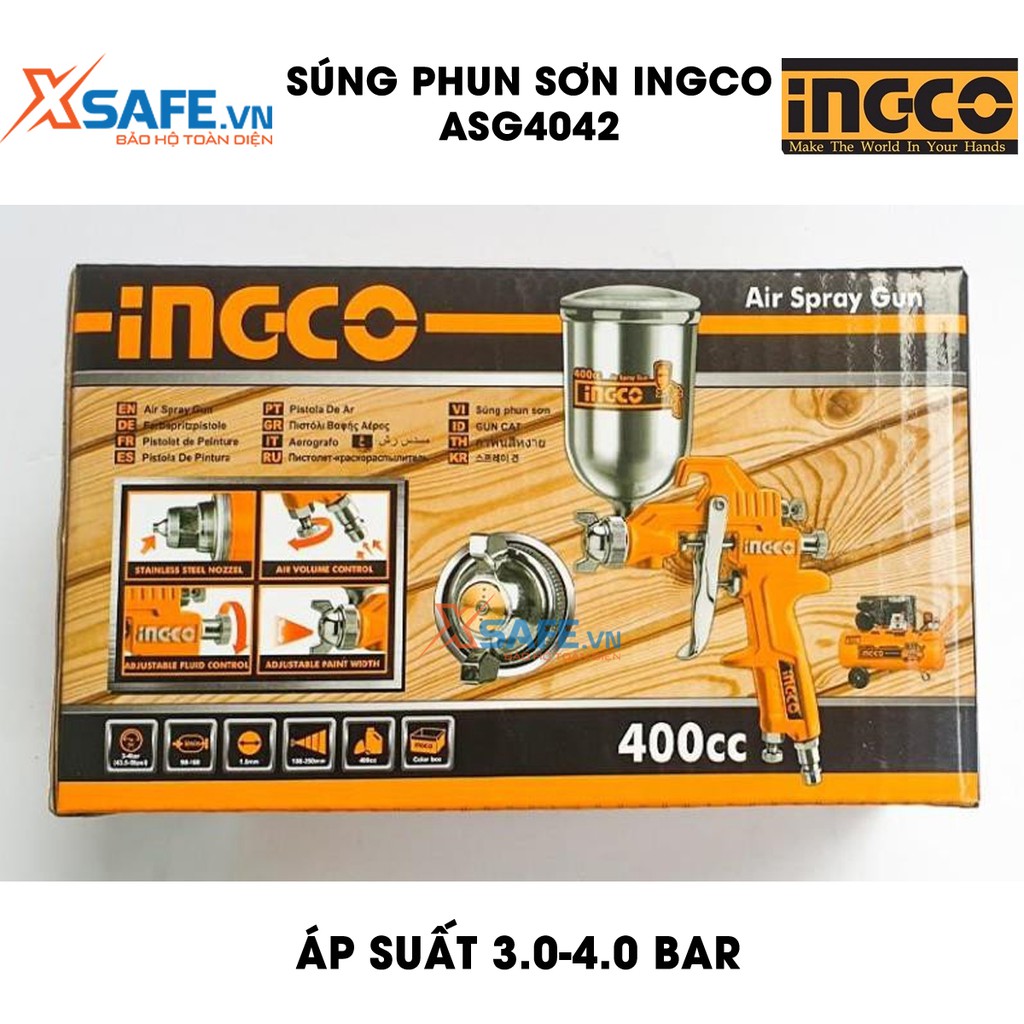 Giới thiệu Súng phun sơn INGCO ASG4042 - Súng phun sơn đầu phun tiêu chuẩn 1.5mm, áp suất 3.0-4.0 bar, thể tích bình nhôm 400cc