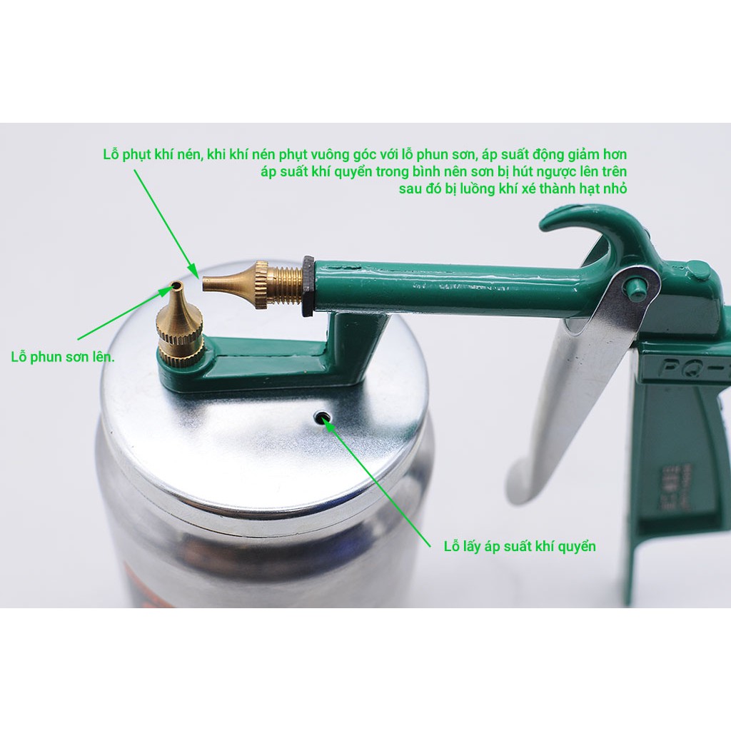 Súng phun sơn dùng hơi khí nén dung tích 550cc Berrylion PQ-1A với thân súng đúc khối hợp kim nhôm nhẹ, bình sơn bằng thép không gỉ với lỗ phun sơn đường kính 2mm phù hợp sơn đồ gỗ, sơn tường, sơn sắt, sơn trang trí nội thấtSúng phun sơn Berrylion PQ-1A là kiểu súng phun sơn bình dưới với nguyên lý dùng khí nén phụt qua đầu bình sơn, áp suất động nhỏ hơn áp suất khí quyển kéo sơn lên và xé ra thành các hạt sơn.