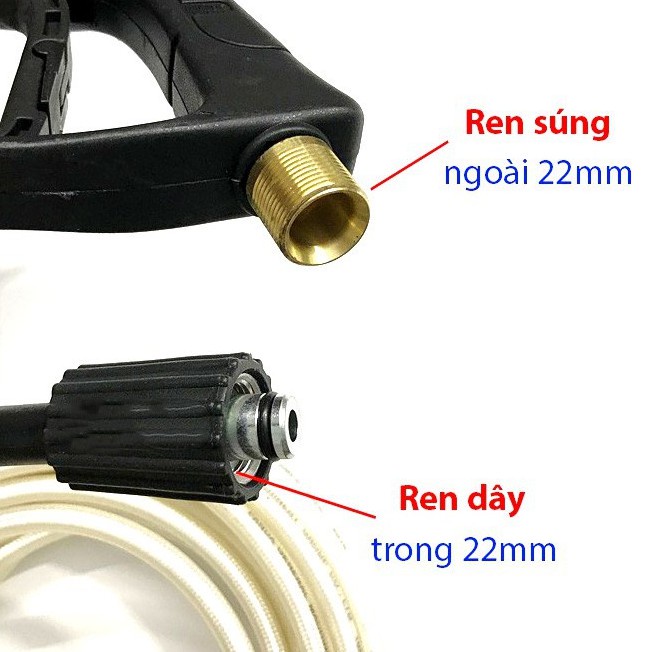 Lưu ý: Hiện nay trên thị trường có hai loại súng rửa xe với chân ren kết nối với dây rửa xe là ren 14mm(nhỏ) và ren 22mm(to).Cho nên khi mua hàng quý khách phải xem súng cũ hoặc dây rửa xe của máy rửa xe nhà mình là chân ren to hay nhỏ để tránh mua nhầm về không lắp được.Súng phun xịt rửa xe áp lực cao tay cam ren ngoài 22mm - đầu lắp được