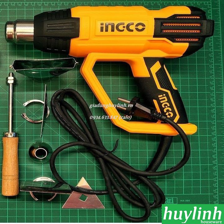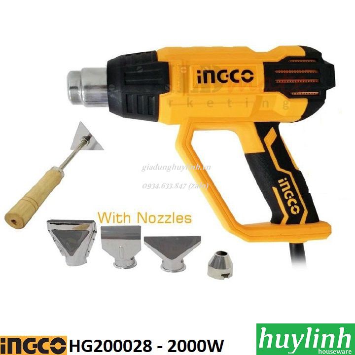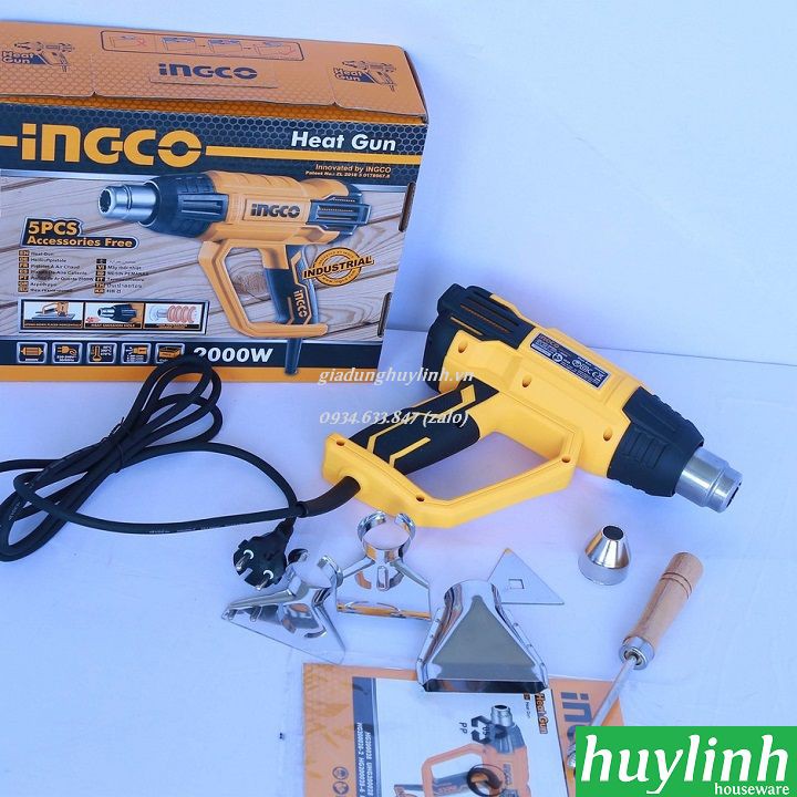 - Máy thổi hơi nóng INGCO HG200028 được tặng kèm bộ phụ kiện như hình, mạnh mẽ với công suất 2000W, là 1 trong những máy thổi nhiệt chất lượng nhưng có mức giá rẻ, luôn nằm trong danh sách bán chạy.