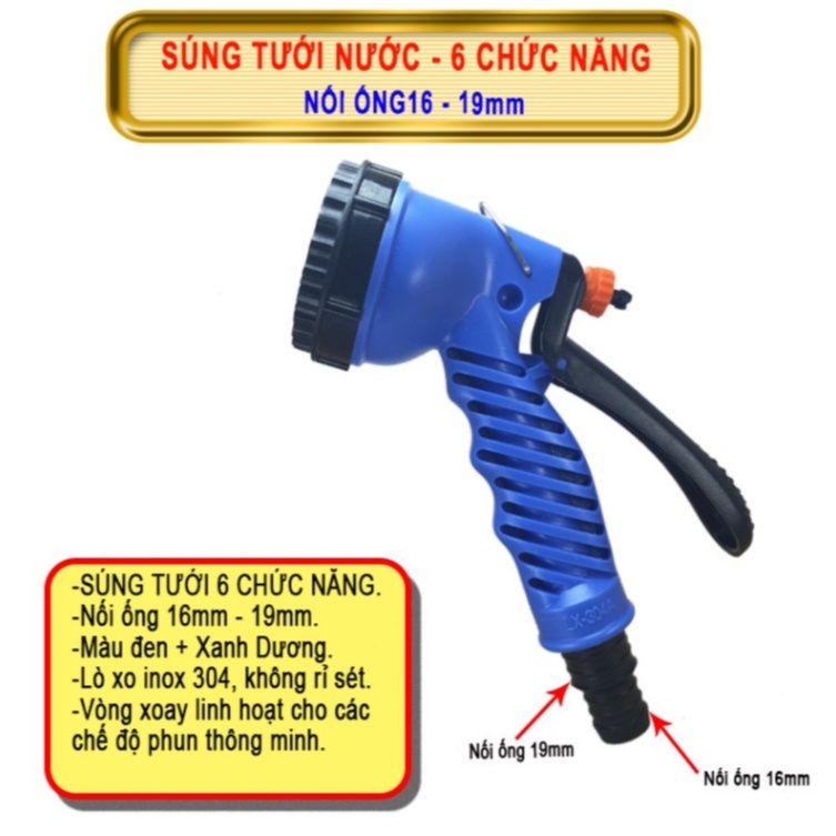 Súng tưới cây - rửa xe 6 chế độ phun nước sẽ giúp bạn thật tiện ích trong công việc làm vườn và dọn dẹp vệ sinh.Với 6 kiểu phun nước giúp cho bạn chọn lựa thích ứng cho mỗi công việc bạn mong muốn.
