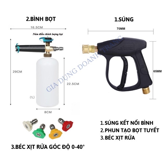 Giới thiệu Bộ súng xịt rửa và bình phun bọt tuyết cao cấp cho máy rửa xe áp lực cao kèm bộ 4 béc phun 0 - 40 độ