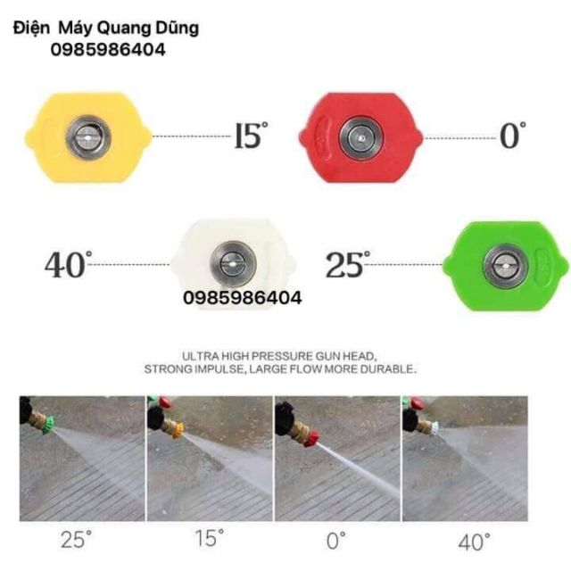 + Bộ 4 béc phun tương ứng góc phun 0 độ, 15 độ, 25 độ và 40 độ (khớp nối 1/4 inch)