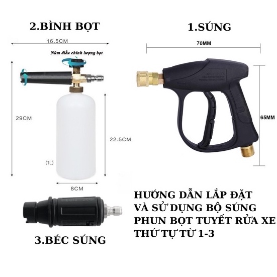 Giới thiệu Bộ súng xịt rửa xe và bình tạo bọt tuyết cao cấp cho máy rửa xe áp lực cao, máy xịt rửa (Ren ngoài 22mm và 14mm)