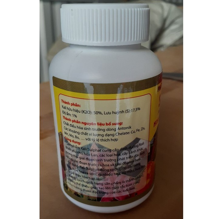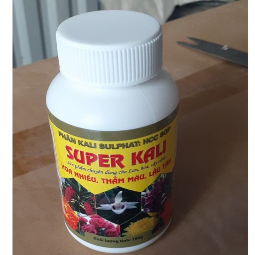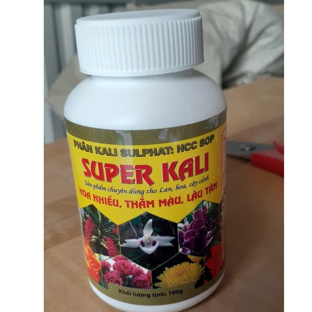 Super Kali – HOA NHIỀU - THẮM MÀU - LÂU TÀN HỘP 100grCÔNG DỤNG cung cấp dinh dưỡng kali thiết yếu cho hoa Lan, cho tất cả các loại hoa cây cảnh khác trong tất cả các giai đoạn. đặc biệt là giai đoạn trước và đang ra hoa sử dụng super kali đúng cách và định kỳ sẽ giúp cây khỏe mạnh, cứng cáp, nhanh ra hoa, nụ mập, hoa to và giữ hoa lâu tàn. cung cấp thành phần thiết yếu giúp lên màu hoa đẹp và hương thơm đặc trừng cho từng loại hoa.