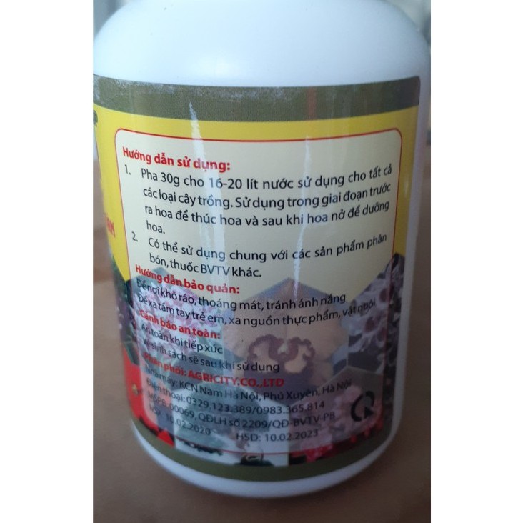CÁCH DÙNG pha theo tỷ lệ 30 gr cho 16-20 lít nước tưới cho tất cả các loại đối tượng hoa cây cảnh và mọi giai đoạn. sử dụng trước khi ra hoa để thúc hoa và duy trì hoa đẹp lâu tàn, lên màu và hương thơm. có thể dùng chung các loại thuốc BVTV khác.