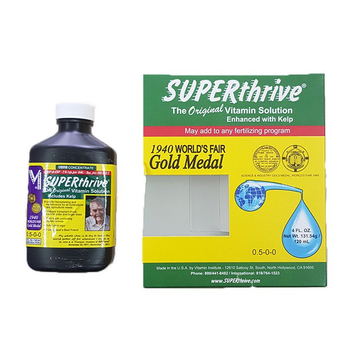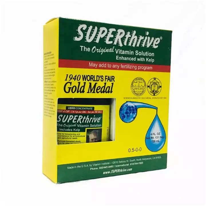 - SuperThrive có thành phần là các chất vitamins và các hormon thực vật kích thích tăng trưởng cho cây trồng, bổ sung 50 hormon làm phá vỡ sự chậm phát triển của cây. Làm cây mau ra rễ, chồi, hoa,… Cực tốt cho lan.