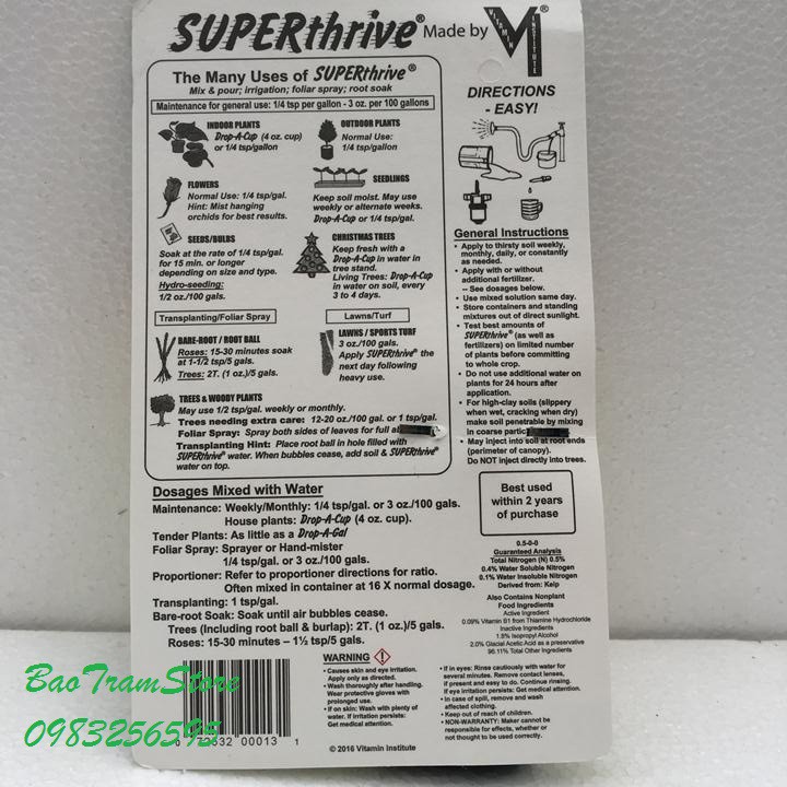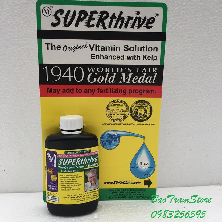 - SuperThrive có thành phần là các chất vitamins và các hormon thực vật kích thích tăng trưởng cho cây trồng, bổ sung 50 hormon làm phá vỡ sự chậm phát triển của cây. Làm cây mau ra rễ, chồi, hoa,… Cực tốt cho lan.