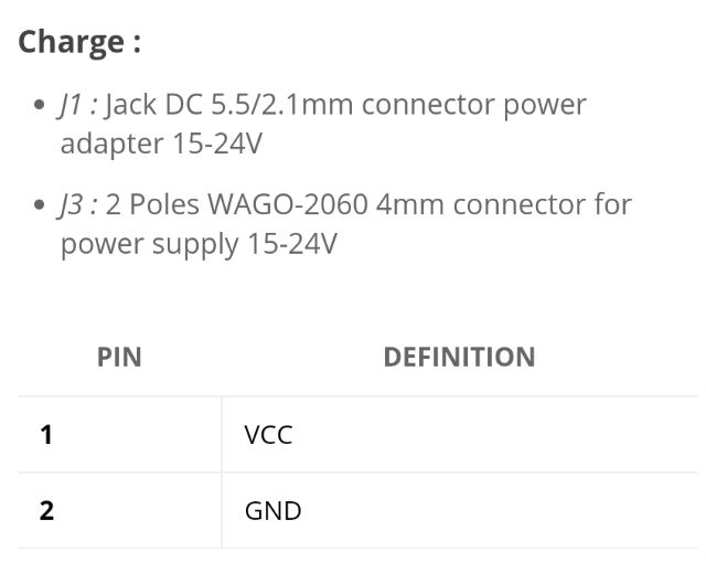 Cấp nguồn 15-24V DC qua đầu nối Jack DC 5.5 / 2.1mm hoặc 2 cực