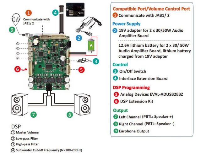 +JAB1 và JAB2 cung cấp giải pháp âm thanh nổi cho loa Bluetooth. JAB3, ngoài việc cung cấp bộ khuếch đại tai nghe, bao gồm DSP. Điều này có nghĩa là khi JAB3 hoạt động với JAB1 / 2, bạn sẽ có được hệ thống âm thanh 4.0 (BTL), 2.1 và 0.2 (PBTL) hoàn chỉnh với giao diện điều khiển và xử lý tín hiệu.