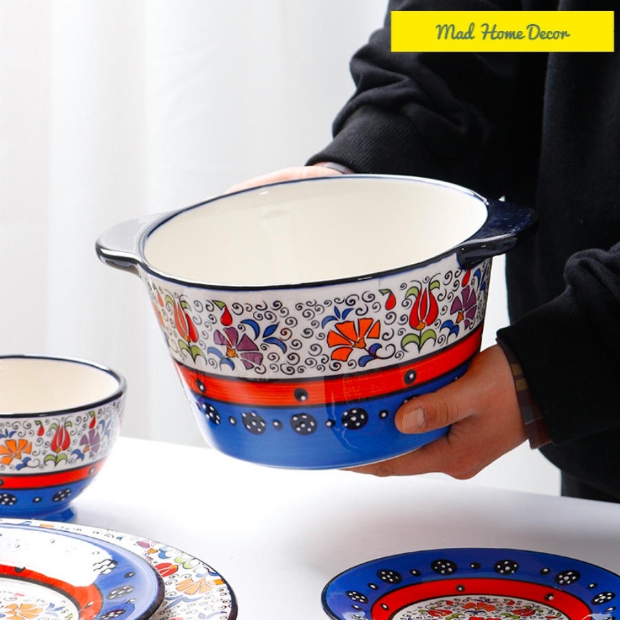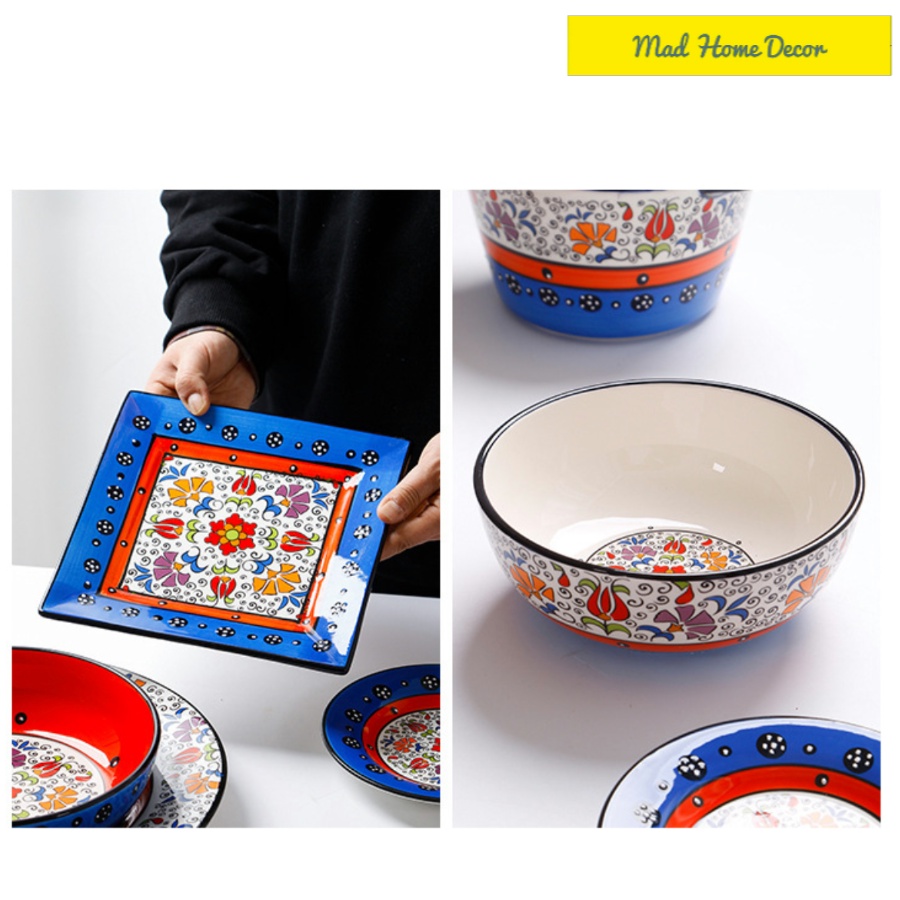 Bộ sưu tập bát đĩa, cốc, bình hoa gốm mỹ nghệ Bohemiann nền xanh vẽ tay hàng cực phẩm 2021