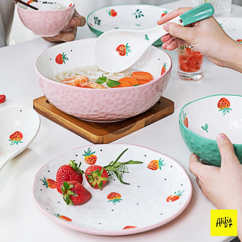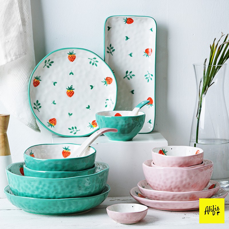 Bộ sưu tập bát đĩa sứ, bát đĩa decor họa tiết dâu tây xanh, hồng – Phụ kiện bàn ăn (Bán lẻ theo món)