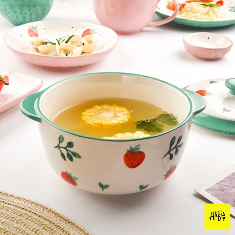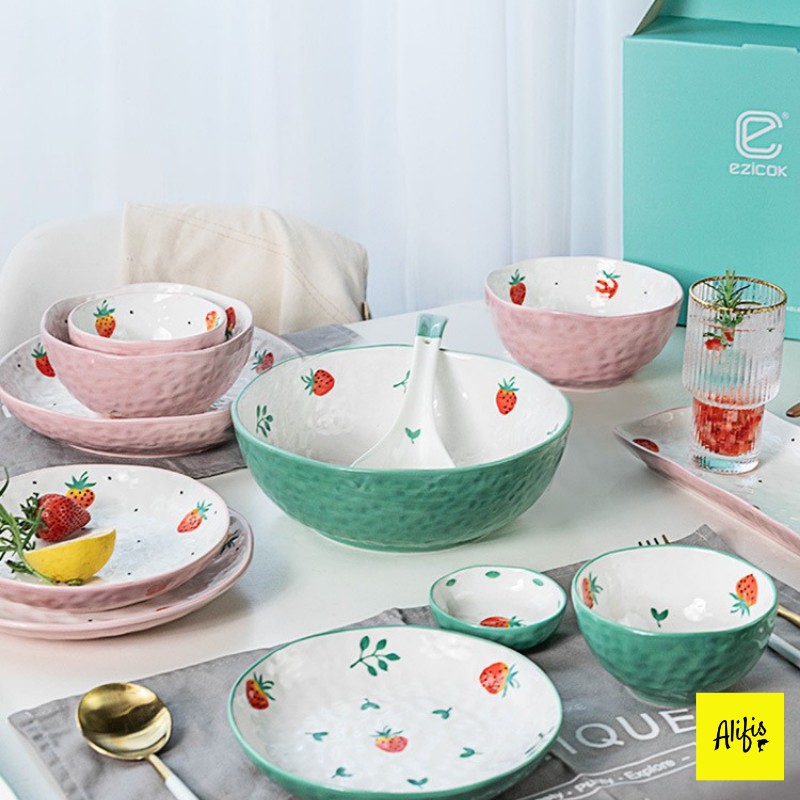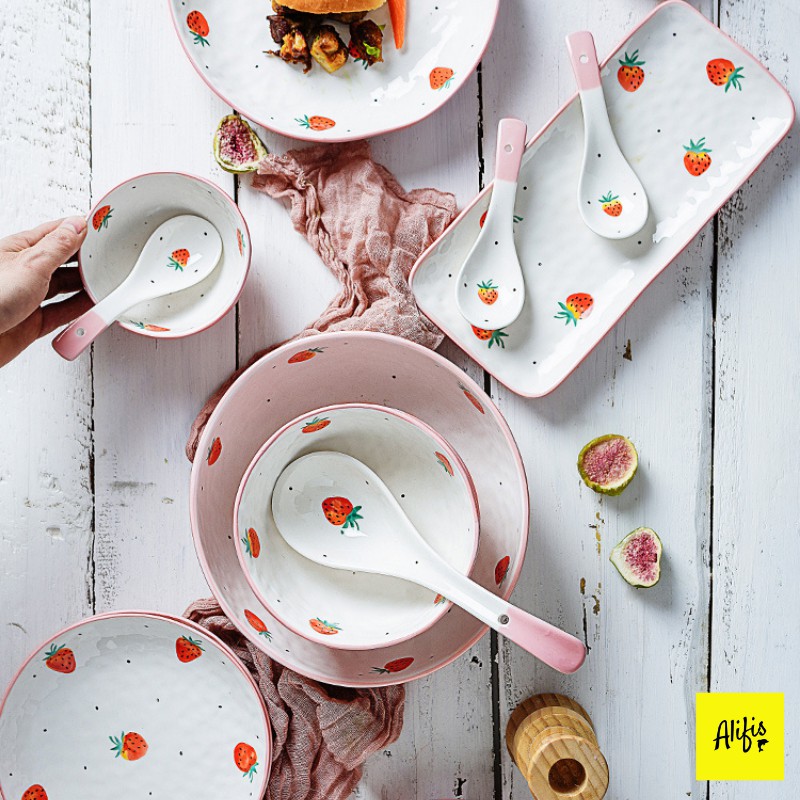 + Bộ sưu tập bát đĩa sứ được thiết kế độc đáo với họa tiết dâu tây hồng, dâu tây xanh siêu yêu ạ.
