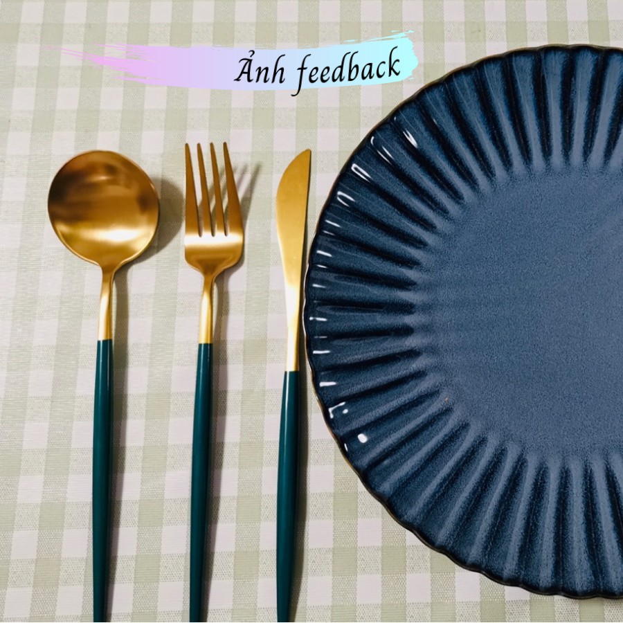 Bộ sưu tập dao đũa thìa dĩa inox 304 mạ vàng tay cầm xanh cổ vịt cao cấp