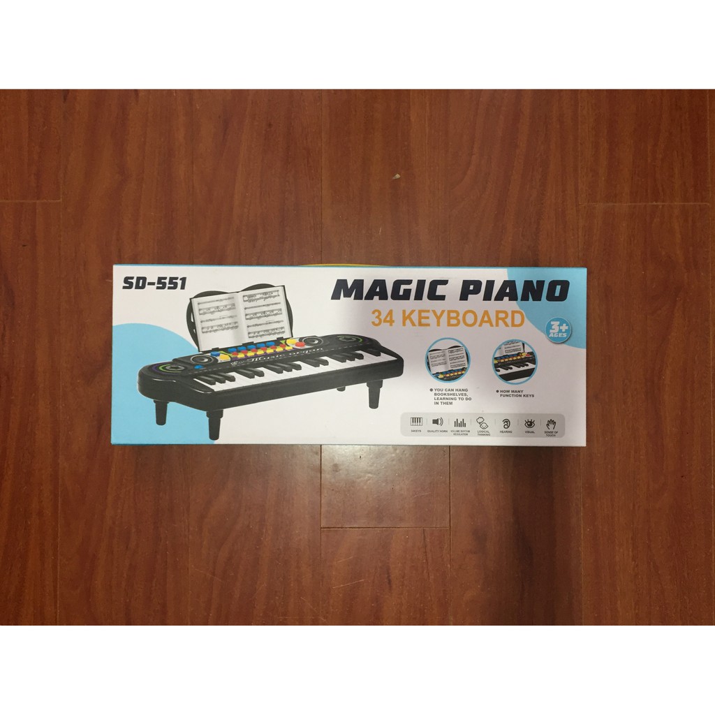 6. Piano Có Cây Chống, size hộp:43*16*5 cm, pin AA x 3 size 1,5V, 34 phím, tích hợp 9 chức năng âm thanh nhạc cụ khác, 8 thể loại nhạc, 8 bài demo nhạc.