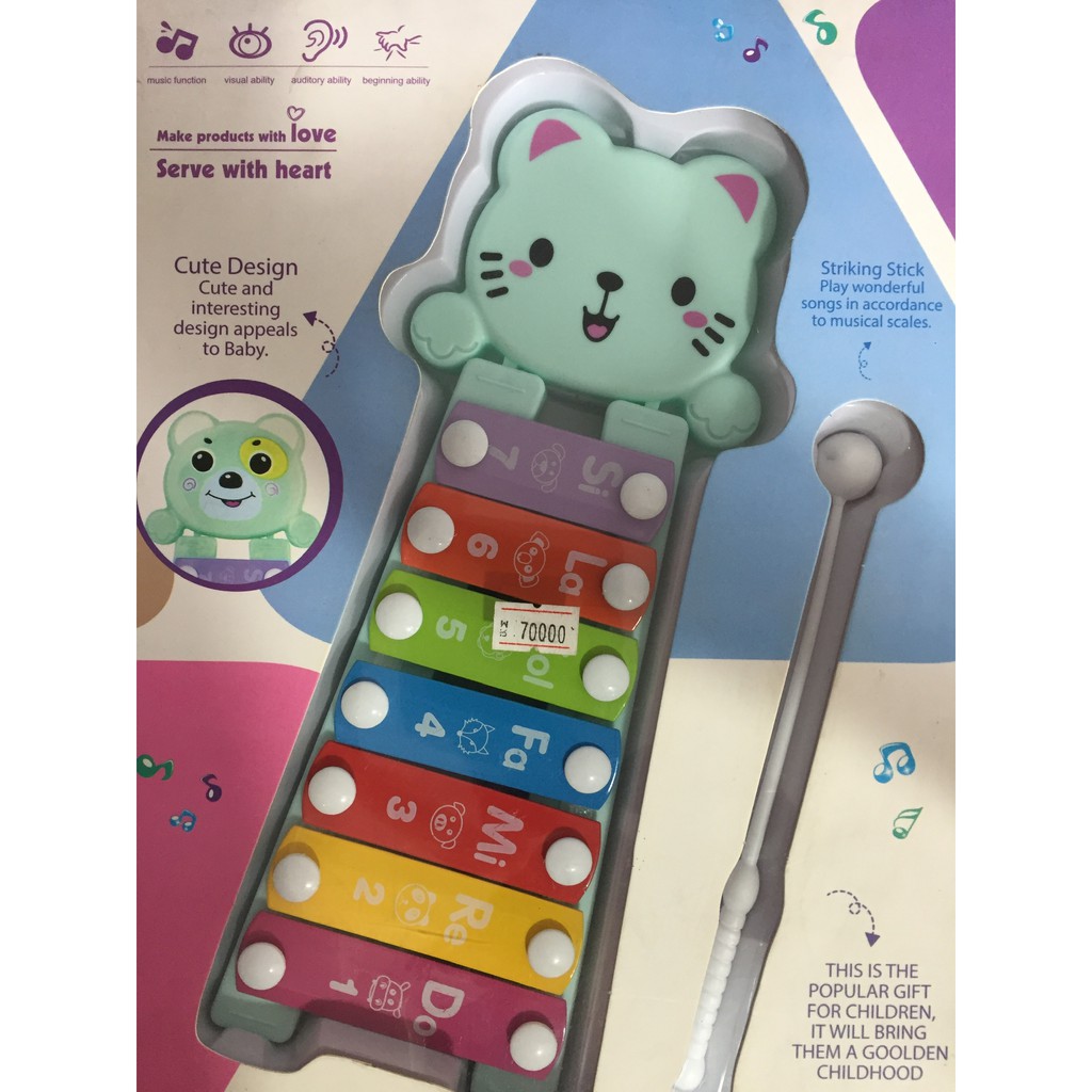 7. Đàn Gõ Khác Biệt, size hộp:22*32*3 cm, không pin, 7 âm tay gõ bằng nhựa, miếng gõ bằng kim loại.