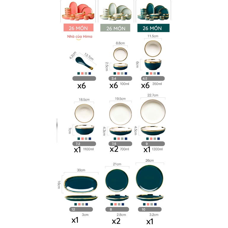 Bộ sưu tập set 26 món viền vàng-3 màu sang chảnh, phong cách Châu Âu