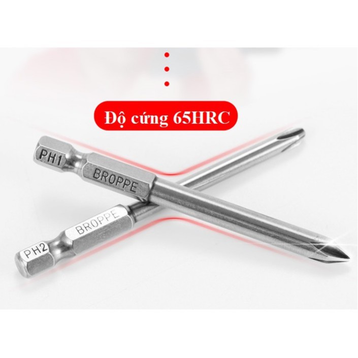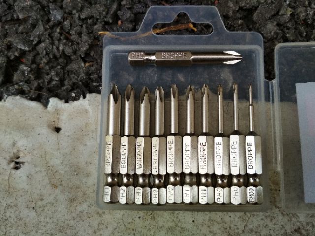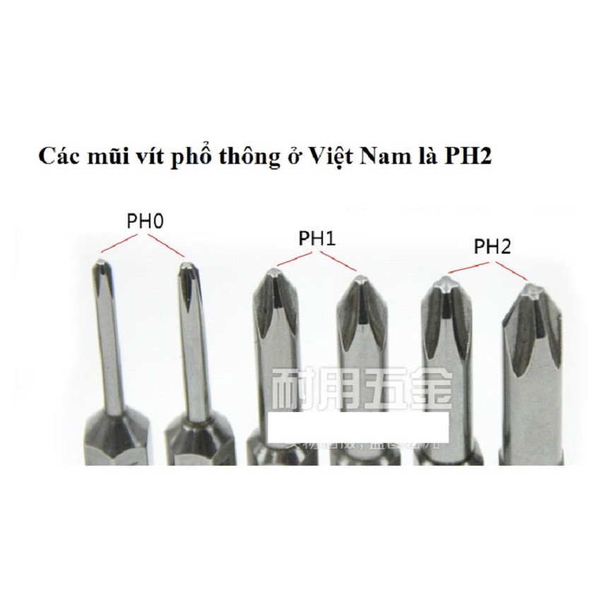 - Bộ 12 mũi tô vít chuôi lục dài 5cm gồm: 1,6mmPH00, 2mmPH0, 2,5mmPH0, 3mmPH1, 4mmPH1, 4mmPH2, 4,5mmPH1, 4,5mmPH2, 5mmPH1, 5mmPH2, 6mmPH1, 6mmPH2.