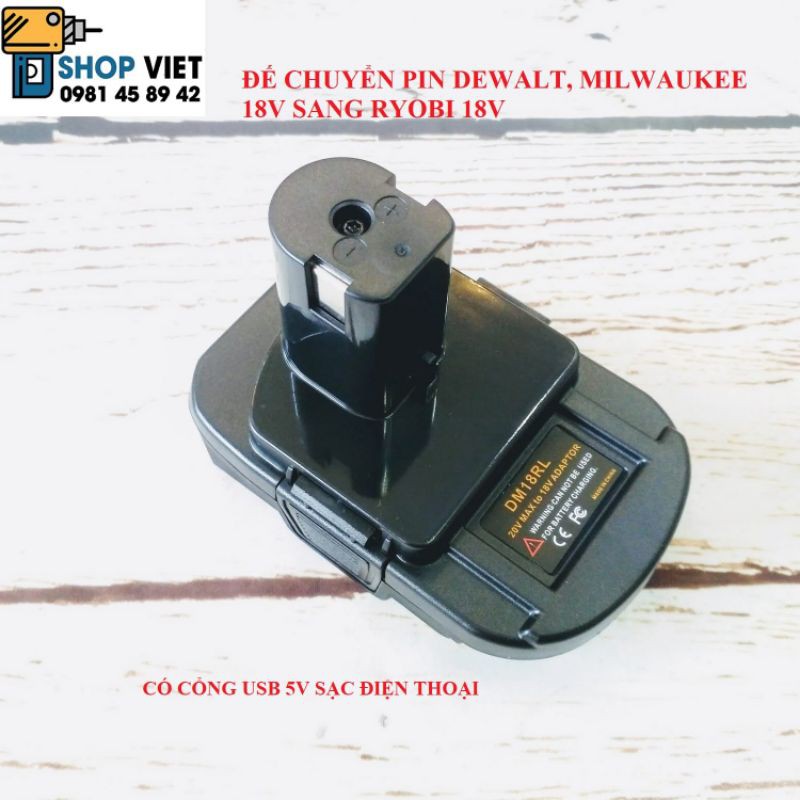 + Chuyển từ pin Dewalt hoặc Milwaukee thành pin Ryobi 18V (có thêm cổng USB 5V sạc điện thoại)
