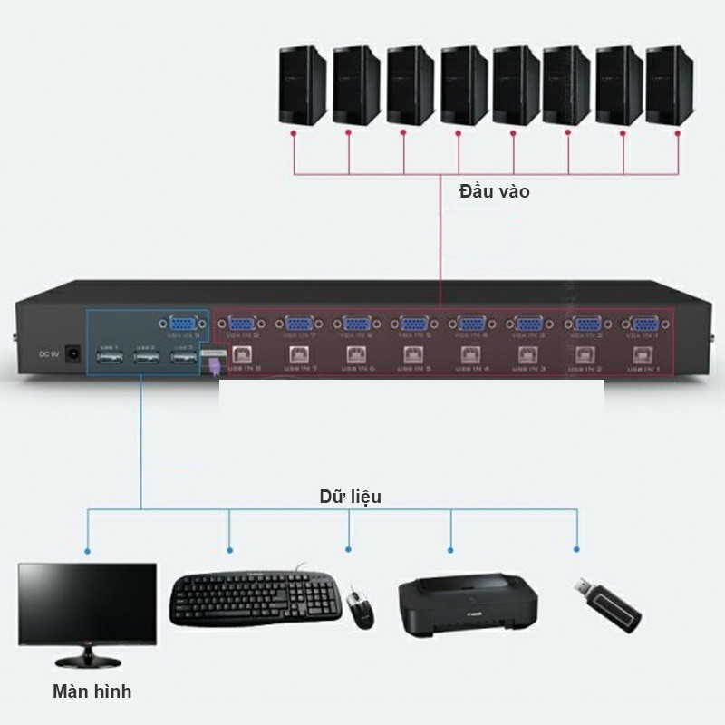 - Đầu vào 8 cổng VGA và 8 cổng USB