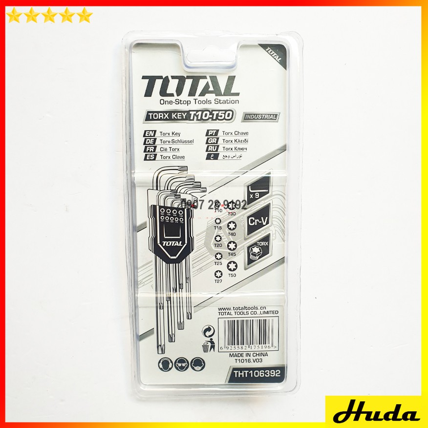 T10-T50 Bộ lục giác bông 9 chi tiết Total THT106392- Bộ lục giác Total THT106392 được chế tạo từ chất liệu có hàm lượng Cacbon cao nên cứng cáp, chịu được lực cao, không dễ gãy hay hư hỏng như sản phẩm thông thường khác, bền theo thời gian.