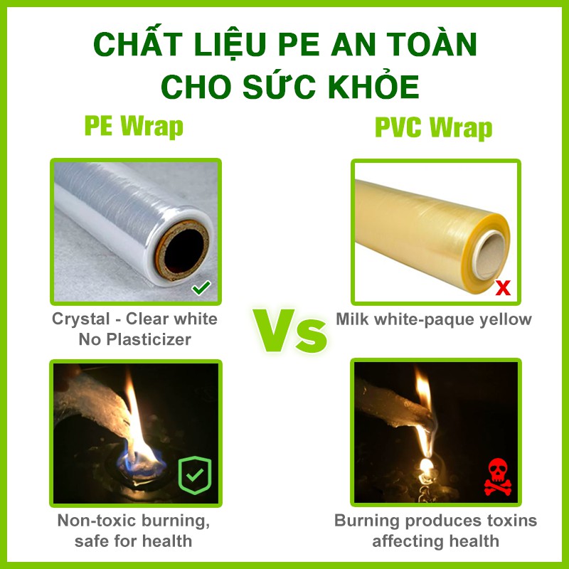 (PE là chất liệu trong suốt, không có mùi khi bị đốt cháy có thể trực tiếp sử dụng với thực phẩm.)