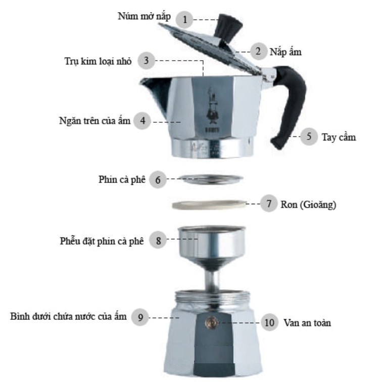 - Vặn chặt phần trên của bình cà phê vào bình nhỏ nhưng không ấn lên tay cầm.