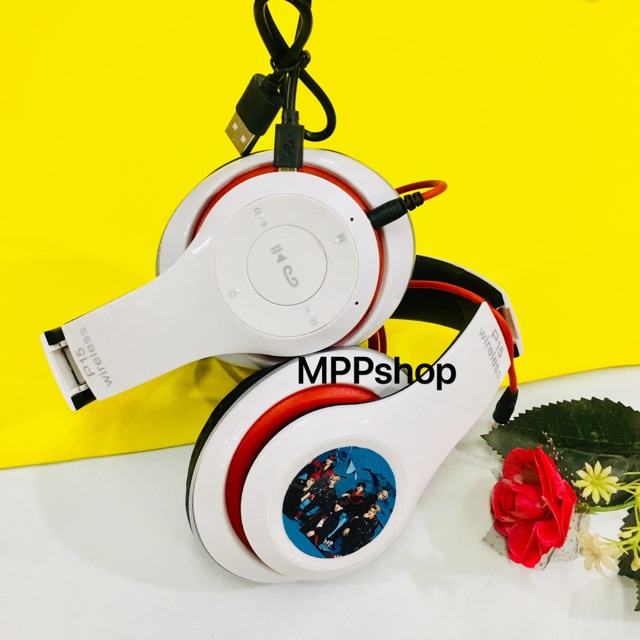 Tai nghe heatphone Bluetooth BTS in hình ảnh có nút bấm chuyển