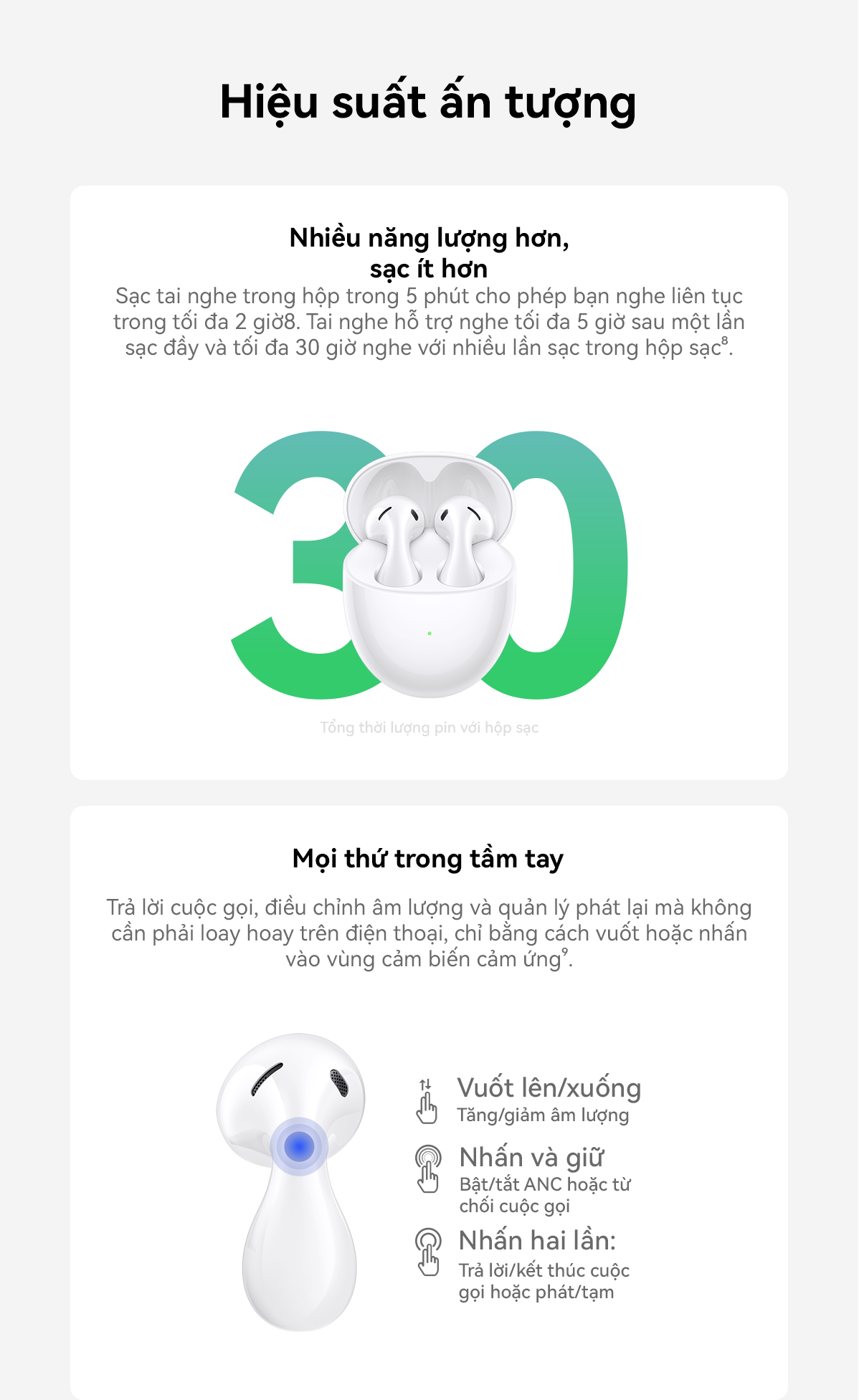 | Thời gian pin | Tuổi thọ pin:Chỉ phát nhạc bằng tai nghe (tắt ANC): 5 giờChỉ phát lại nhạc bằng tai nghe (bật ANC): 3,5 giờPhát nhạc với nhiều lần sạc trong hộp (tắt ANC): 30 giờPhát lại nhạc với nhiều lần sạc trong hộp (bật ANC): 20 giờLưu ý: Thời lượng pin và dữ liệu sạc được lấy từ các thử nghiệm trong phòng thí nghiệm của Huawei. Thời lượng pin và thời lượng sạc thực tế sẽ khác nhau tùy thuộc vào âm lượng, nguồn âm thanh, môi trường, cách sử dụng và các yếu tố khác.*Dữ liệu được lấy từ các thử nghiệm trong phòng thí nghiệm của Huawei. Nguyên mẫu của HUAWEI FreeBuds 5 và phần mềm đi kèm đã được thử nghiệm với HUAWEI P50 Pro.Kiểm tra phát lại âm thanh: Tai nghe được kết nối với điện thoại qua Bluetooth để phát lại âm thanh ở định dạng AAC với mức âm lượng được đặt thành 50%. Âm thanh tiếp tục phát cho đến khi âm thanh ngừng phát từ một trong các tai nghe.Để sạc hộp sạc, căn chỉnh phần giữa của cuộn dây sạc không dây với phần giữa của bộ sạc không dây và điều chỉnh vị trí một chút cho đến khi đèn báo bật sáng. Hộp sạc hỗ trợ sạc không dây được chứng nhận Qi. Một số bộ sạc không dây có thể không sạc được hộp sạc đúng cách. |