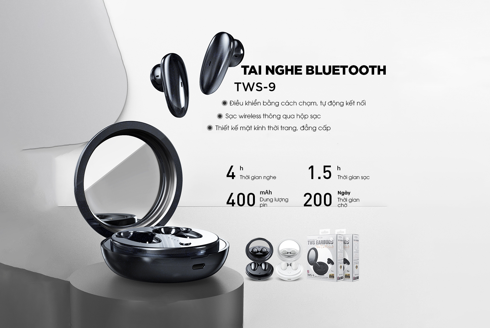 Hộp đựng kiêm docl sạc cực sang chảnh với 1 chiếc gương mini đi kèm rất tiện lợi, thuận tiện dùng trong nhiều trường hợp. Quả thực TWS-9 được sinh ra dành cho những quý cô và anh chàng sành điệu.