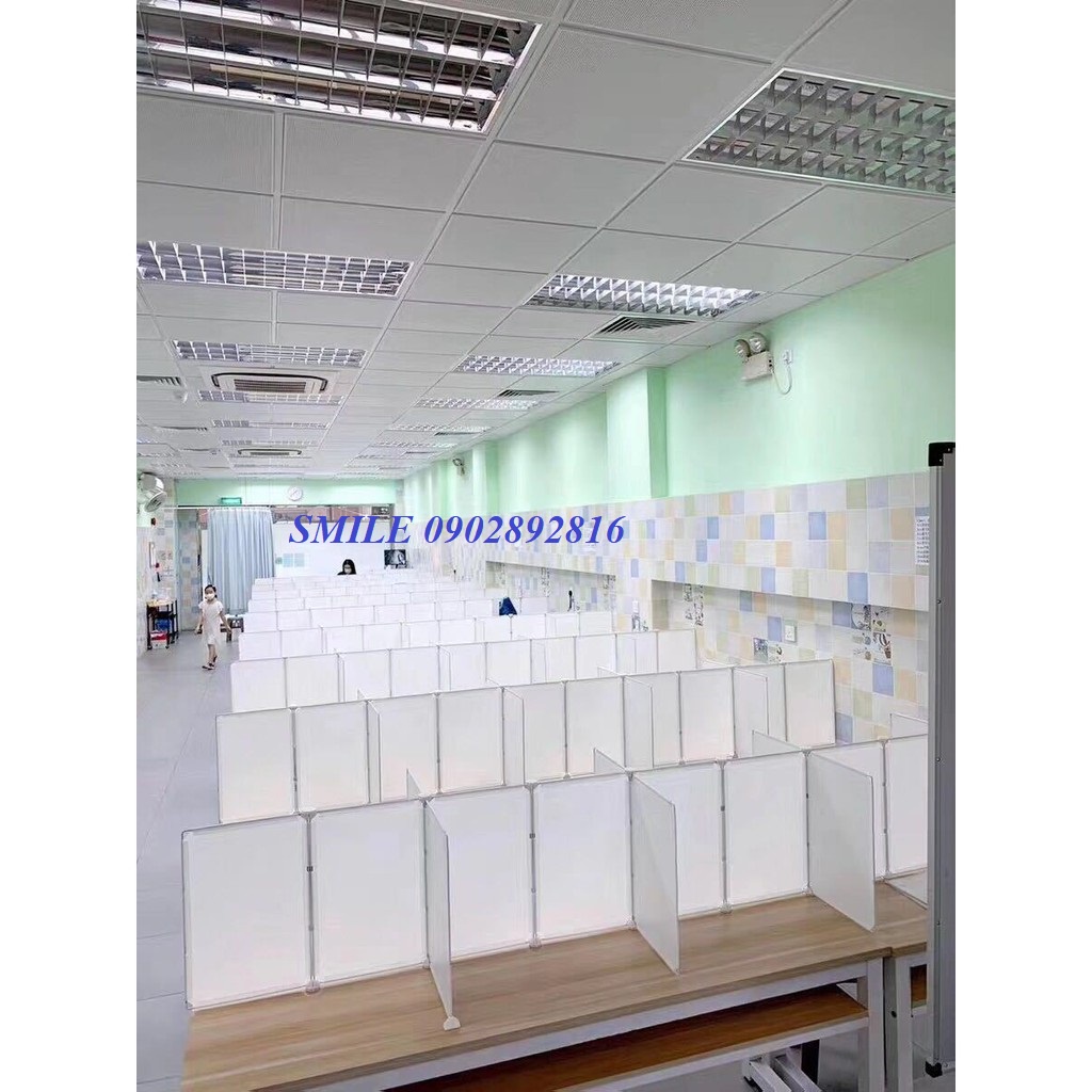 Gồm 7 tấm nhựa 45*35cm được lắp ghép với nhau bằng các chốt nhựa ABS nối khớp chắc chắn, chia thành 6 vách ngăn đặt trên bàn để phân cách chỗ ngồi cho 6 người.Tấm nhựa lắp ghép chống giọt bắn hay còn gọi là vách ngăn phòng dịch là giải pháp ngăn ngừa sự lây lan trong môi trường làm việc, mua bán, trường học...