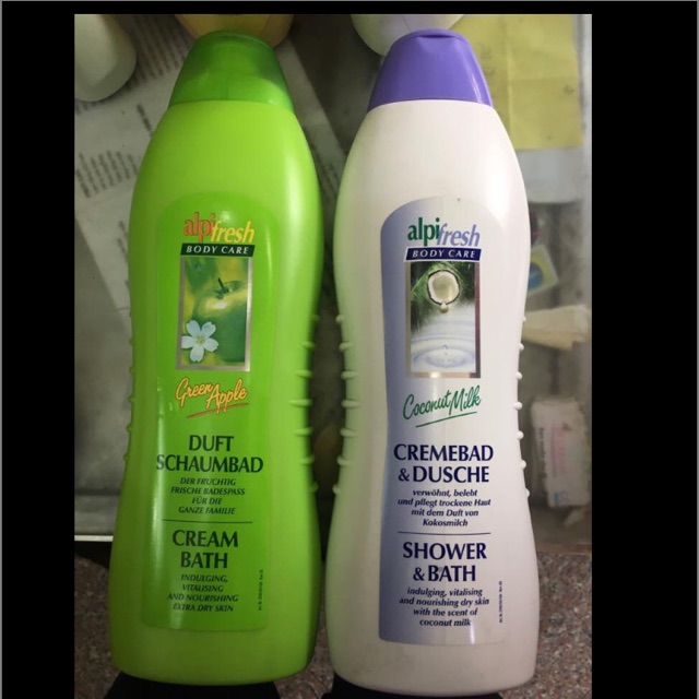 Tắm Đức 1000gSữa tắm dạng gel sản xuất tại Đức. Có thể tắm bồn hoặc tắm sen đứng, nhiều bọt, phù hợp với mọi thành viên trong gia đình. Có hai mùi táo và dừa. Ghi chú: táo xanh đắt hàng hơn cả