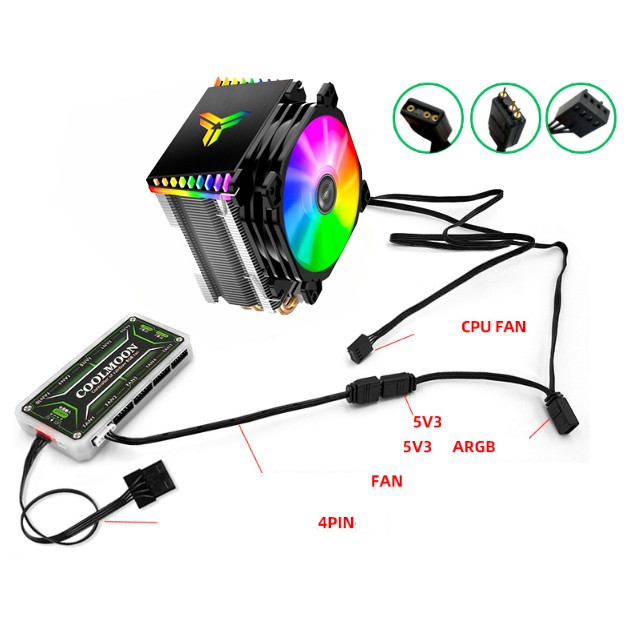 👎 Nếu bo mạch chủ không có chân cắm Led A-RGB Sync (Addressable RGB LED Header) thì mua bộ Hub Coolmoon và cáp chuyển nguồn Led từ Hub Coolmoon ra Led của tản - Nếu quý khách đã có bộ Hub Coolmoon rồi thì chỉ cần mua cáp chuyển nguồn Led từ Hub Coolmoon ra Led của tản thôi. Một số Hub của các hãng khác có thể có sẵn chân cắm Led A-RGB Sync rồi nên không cần mua cáp chuyển.