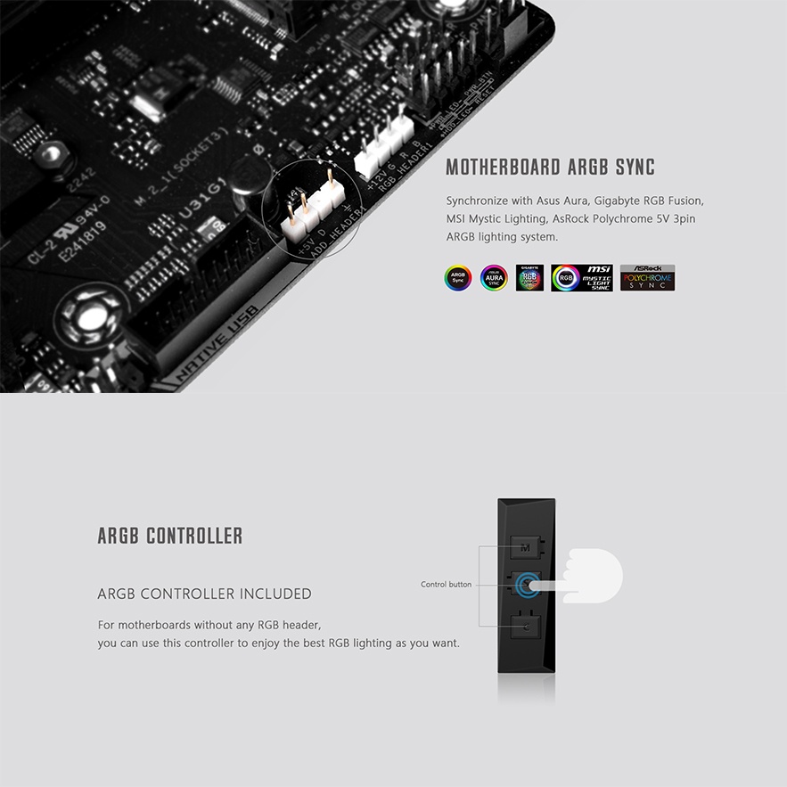 Hỗ trợ đồng bộ LED RGB qua cổng 5V (3pin) điều khiển bằng phần mềm như AURA SYNC, MYSTIC LIGHT SYNC, RGB FUSION...