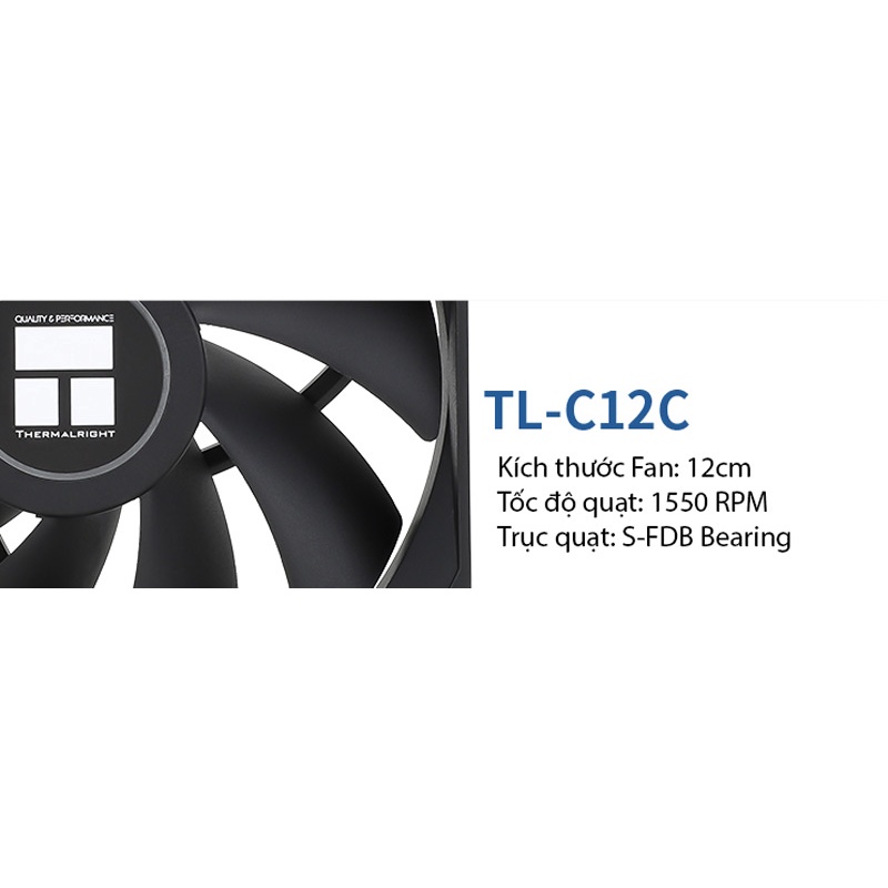 Quạt kèm theo tản nhiệt là dòng quạt TL-C12C. Quạt có đường kính 12cm, sở hữu thiết kế quạt 9 cánh quen thuộc của Thermalright. Lưu lượng gió đạt 66.17 CFM với mức áp lực 1.53 mmH20. Một mức gió phù hợp cho dòng tản tháp có kích thước khiêm tốn như Thermalright AX120R SE. Tốc độ quay của quạt chỉ 1550 RPM, kết hợp cùng trục S-FDB Bearing, độ ồn khi hoạt động ổn định ở mức 25.6 dbA. Giảm thiểu độ ồn trong suốt quá trình hoạt động, tránh gây ảnh hưởng đến người dùng.