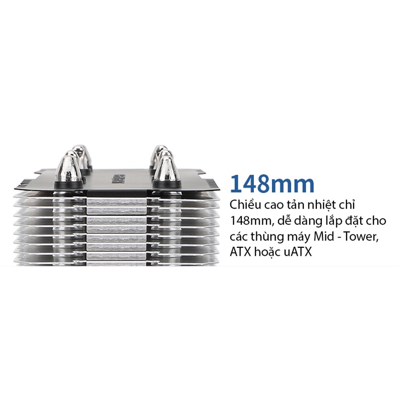 Phần tháp tản nhiệt của Tản Nhiệt CPU Thermalright AX120R SE được thiết kế nhỏ gọn, với bề ngang chỉ 120mm và chiều cao tối đa cực kỳ khiêm tốn chỉ 148mm. Tối ưu hóa không gian bên trong thùng máy, tăng đối khả năng đối lưu không khí. Dễ dàng lắp đặt trên các thùng máy có kích thước nhỏ, khiêm tốn, Mid Tower, hay các thùng máy chuẩn MATX, ATX