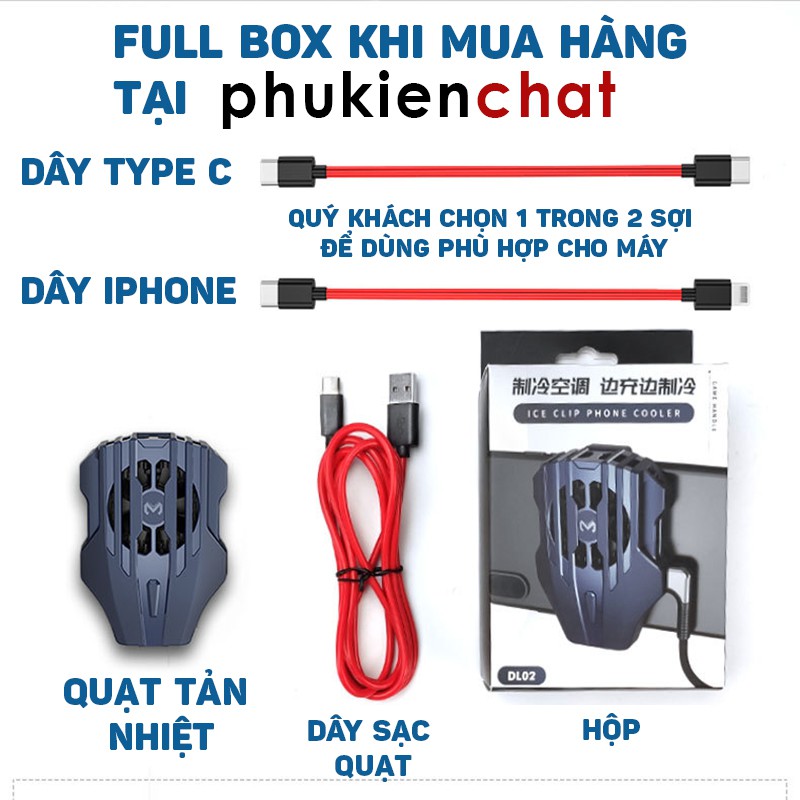 - Bộ sản phẩm : 01 x quạt tản nhiệt Memo DL02 , 01 Cáp sạc Type C USB 1,5m, 01 x cáp sạc Type C hoặc 01 x Cáp Lighting ( 30cm)