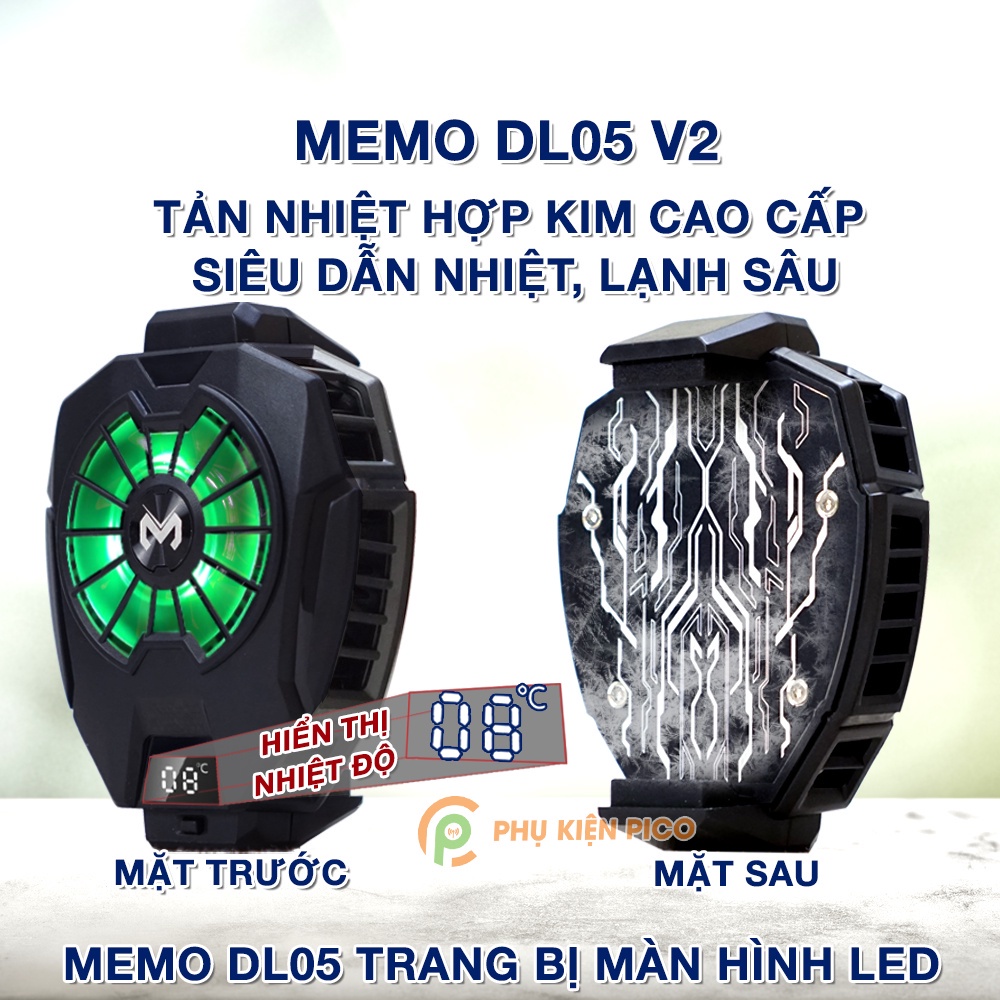 - Memo DL05 Version 2 mới ra mắt 2021 là bản nâng cấp toàn diện của dòng Memo Sò lạnh. Memo DL05 sử dụng sò lạnh công suất cao, có đế tản nhiệt lớn và vật liệu tản nhiệt nhôm cao cấp tốt hơn. Có màn hình LCD hiển thị nhiệt độ.