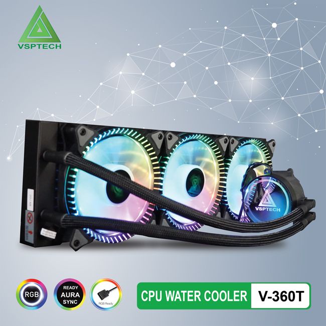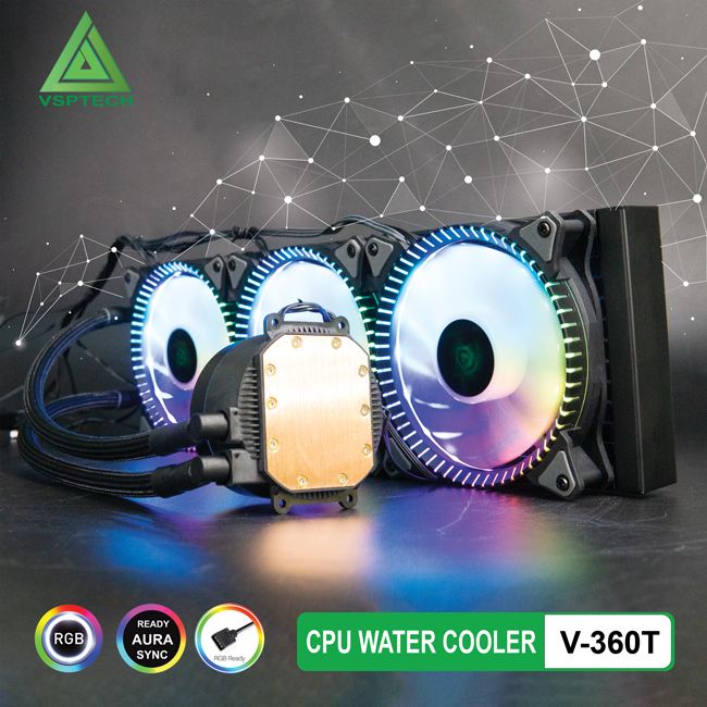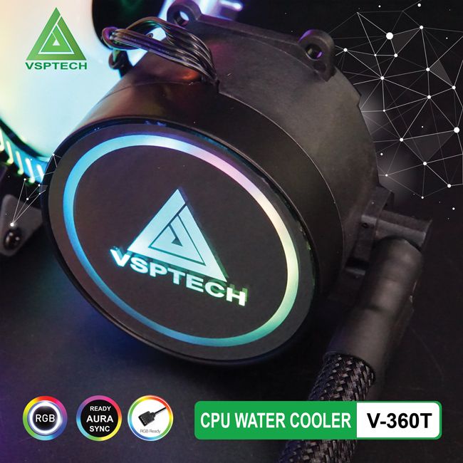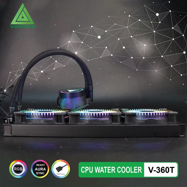Tản nhiệt nước heatsink CPU cooler V-360TĐầu tản nhiệt trang bị máy bơm nước với hệ thống led light sử dụng điều khiển hiệu ứng ánh sáng ARGB, hệ thống được thiết kế phù hợp với quạt áp suất cao với Led light ARGB.