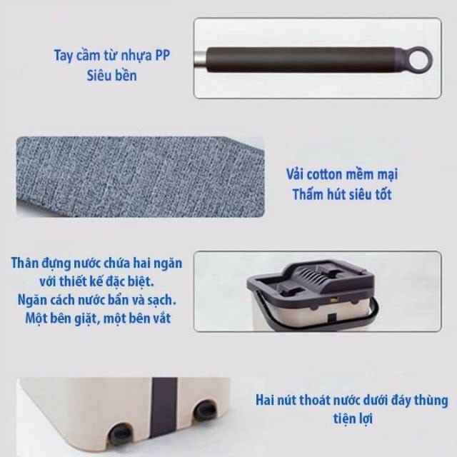 - Sản phẩm bao gồm: 1 bộ cây lâu và thùng vắt + 2 tấm vải lau