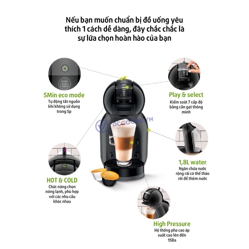 - Máy pha cà phê viên nén Capsule Nescafe Dolce Gusto đầy chuyên nghiệp với công nghệ Flowstop, bạn đã có ngay cho mình một ly cà phê hoàn hảo chưa đầy 1 phút với mức bơm áp suất lên đến 15-bar (Thường thấy ở những loại máy pha cà phê công nghiệp), chỉ một vài thao tác đơn giản và nhấn nút là bạn đã có ngay những cốc cà phê nóng tuyệt vời.