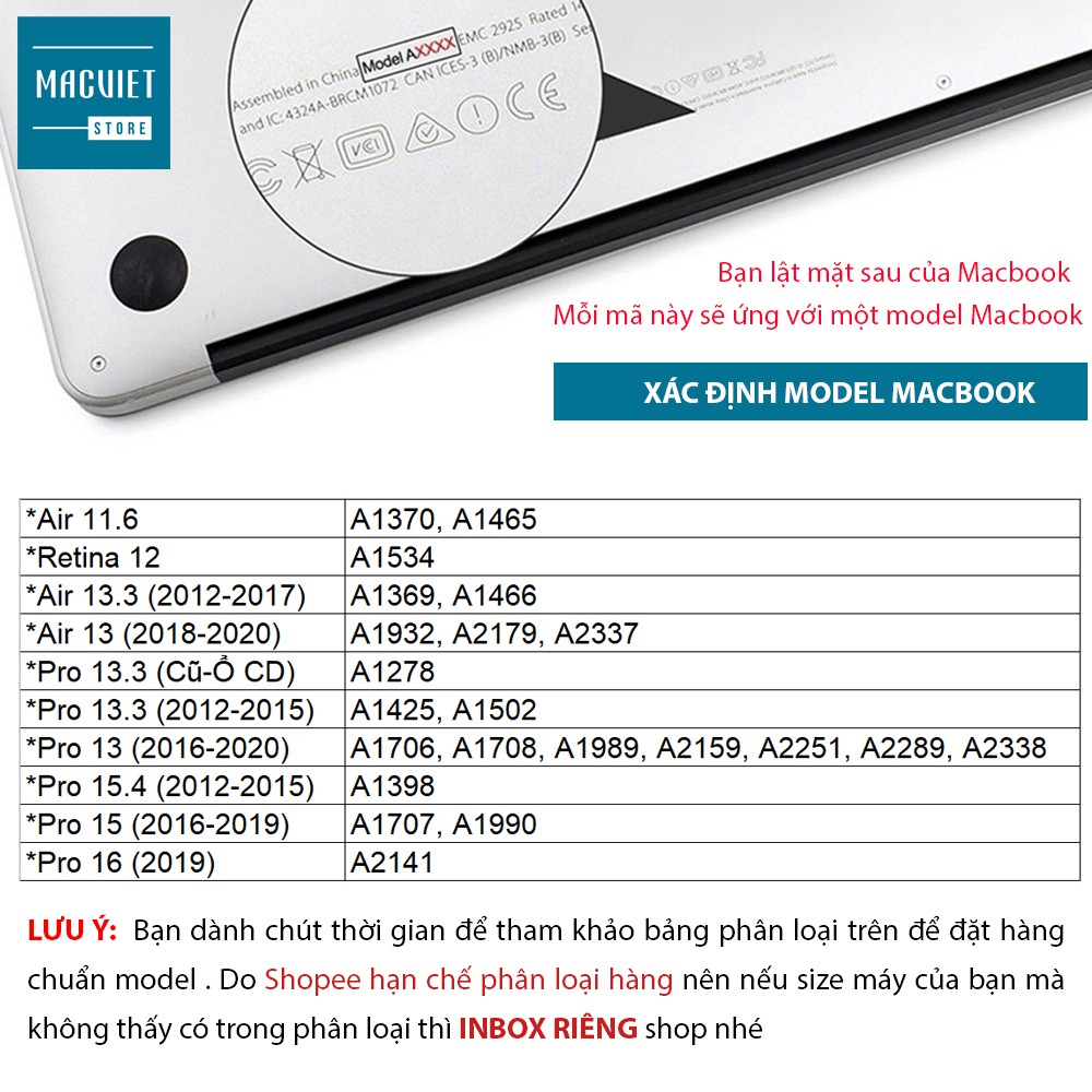 Bạn lật mặt sau của Macbook sẽ có ghi mã Model ( Trên ảnh sản phẩm shop có ảnh hướng dẫn). Bạn đối chiếu với bảng sau