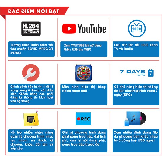 . Chức năng thu sóng DVB T2 vẫn giữ nguyên cho phép người dùng có thể thu được từ 30 đến 70 kênh truyền hình độ nét cao tiêu chuẩn HD hoặc SD ( tùy khu vực ) miễn phí trọn đời