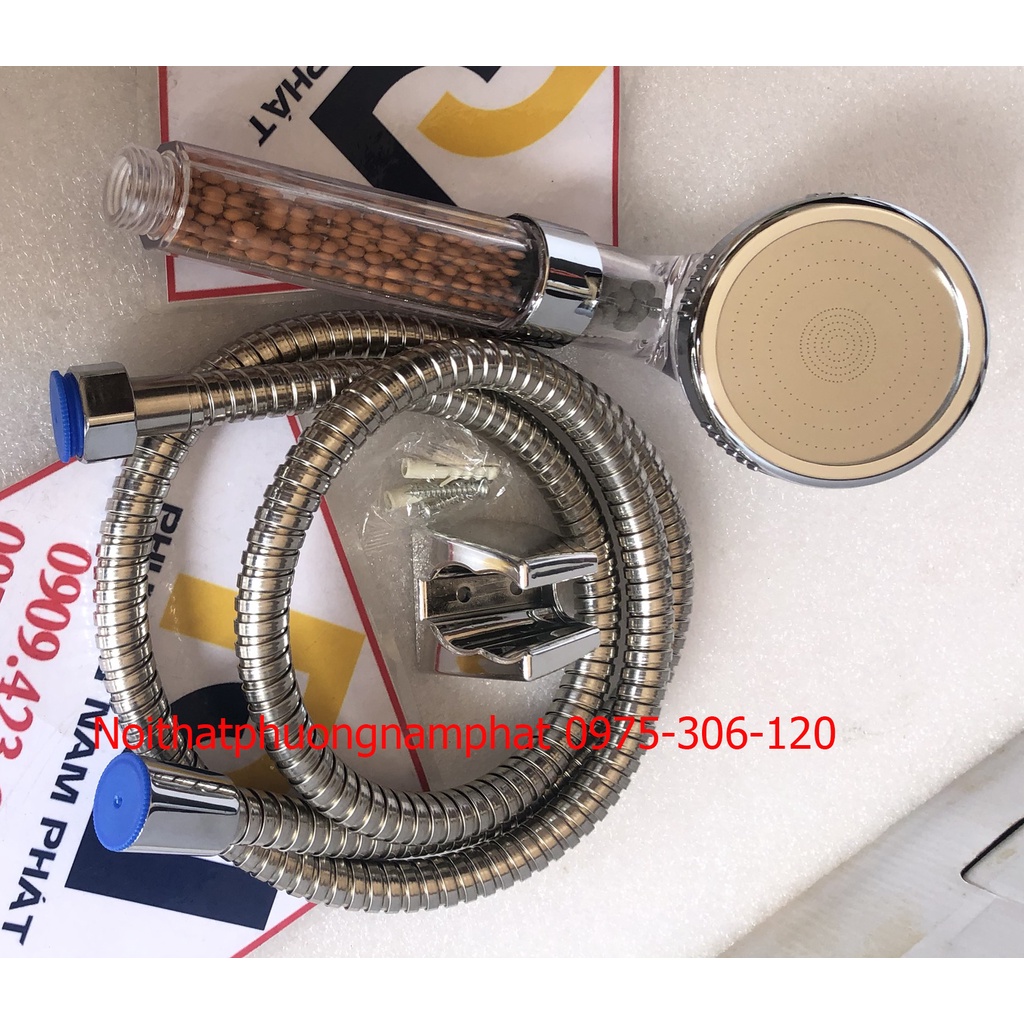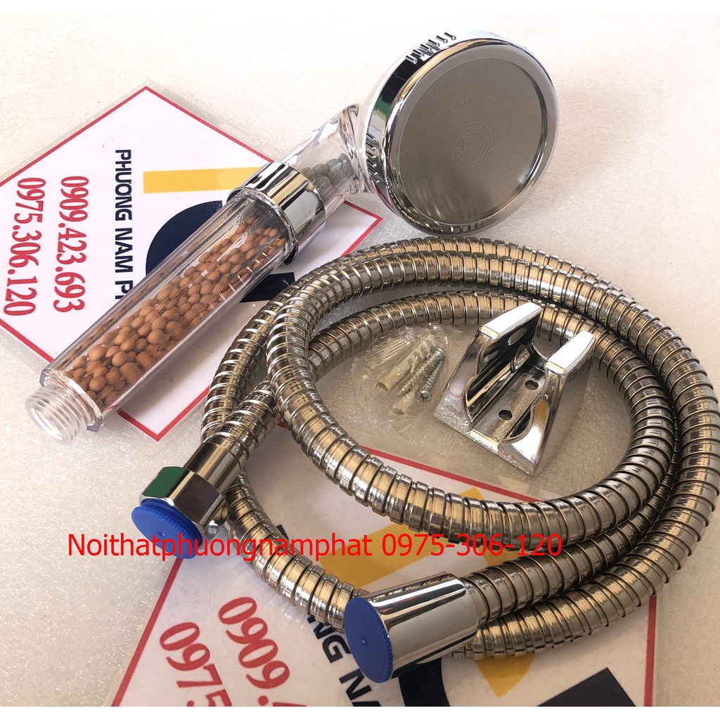 -Bộ sản phẩm gồm: dây sen inox 304 chuẩn, không bị xoắn, dài 1,5m, cài tay sen xi bóng mạ crome, tay sen tắm bằng nhựa ABS nguyên khối mạ bóng Crome và Niken sáng bóng nhìn mới, rất bền