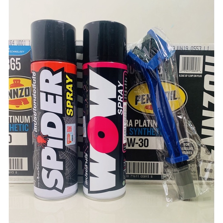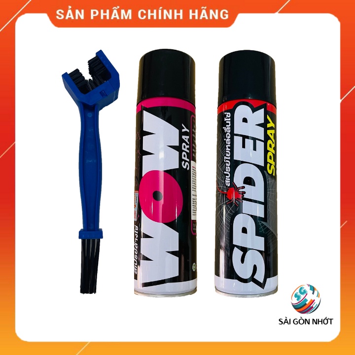 - Sau đó xịt dưỡng sên giúp bôi trơn và bảo vệ sên không rỉ sét với COMBO Spider + Wow (Tặng bàn chải)