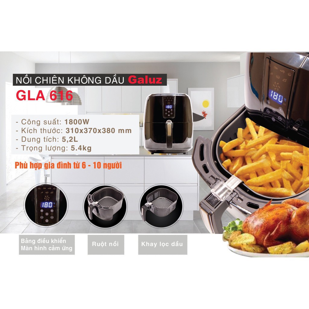 🔥 Nồi chiên không dầu điện tử Galuz 5.2 LIT GLA-616.Sản phẩm được thiết kế đẹp mắt ,điều khiển cảm ứng dễ dàng. Công suất cao cùng dung tích lớn phù hợp với gia đình từ 3-6 thành viên.