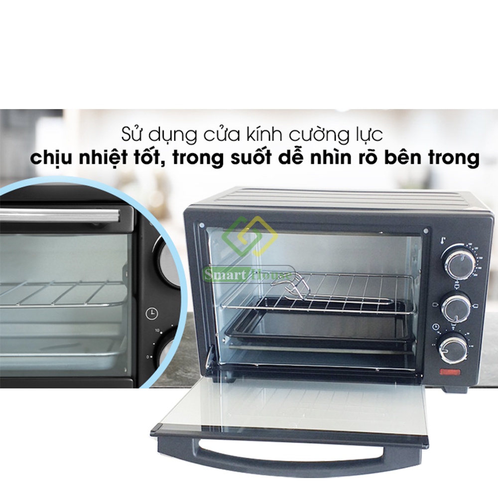 + Cửa kính trong suốt bên ngoài tránh thoát nhiệt và giúp bạn dễ quan sát trong quá trình nướng chín thực phẩm bên trong