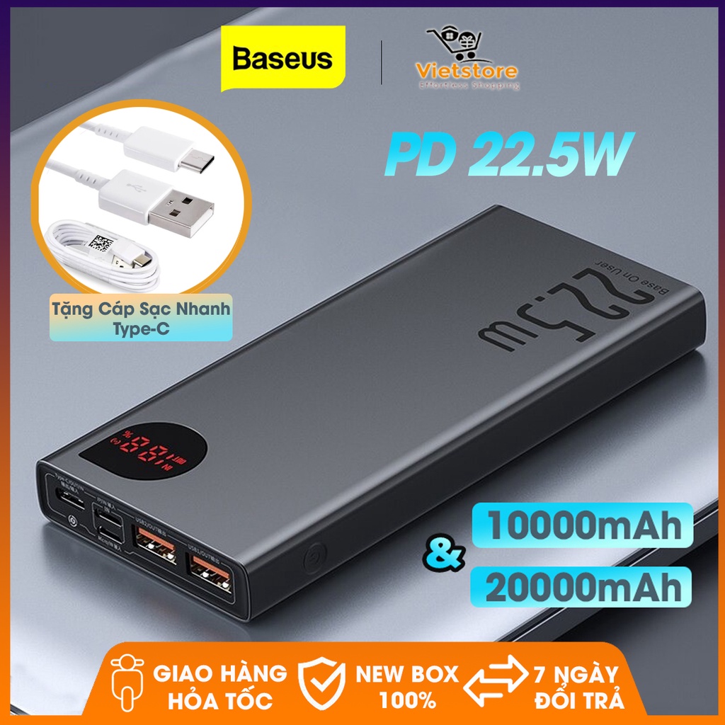 Pin sạc dự phòng 10000mAh và 20000mAhHiệu năng cao 22.5W thiết kế vỏ nhôm siêu mỏng với 2 cổng USB 2 cổng PD và 1 cổng in micro có màn hình hiển thị pin - Phân phối bởi Baseus Vietnam