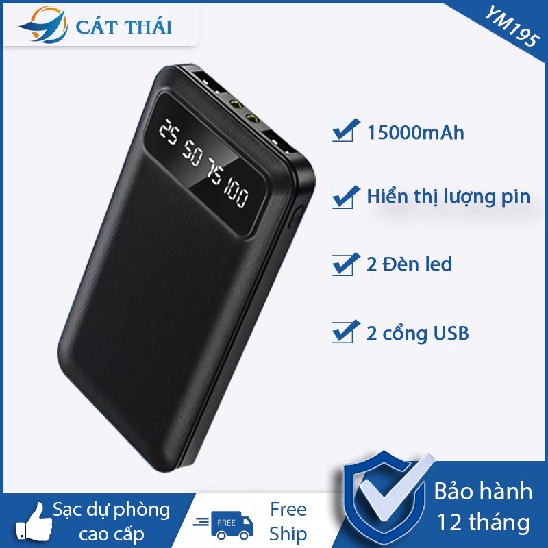 Điện Thoại & Phụ Kiện > Pin sạc dự phòng > 10000 - 20000mAh || [TẶNG CÁP SẠC]Pin sạc dự phòng Cát Thái YM195 dung lượng 15000mAh cực mỏng tăng cảm giác cầm tay 2 cổng USB,2 đèn pinCòn hàng